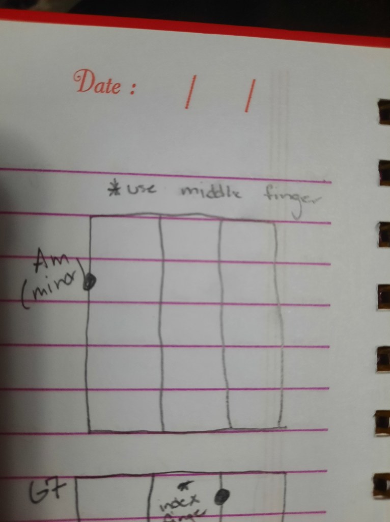 The next note I learnt was a G7. This is the note that will be the death of me as it seems no matter how much I practice it, I still can’t get my fingers to press the strings correctly.